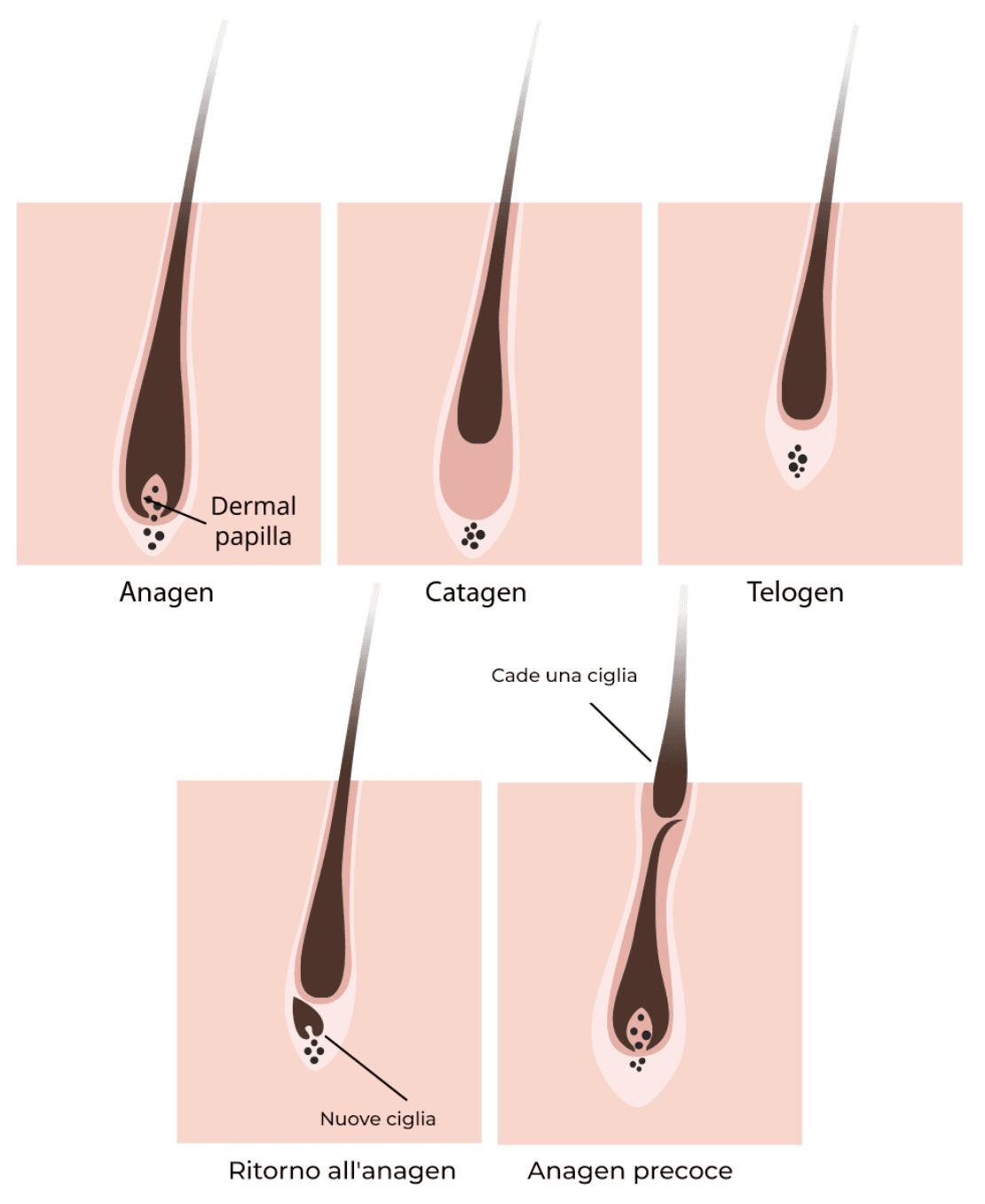 Fase Catagen (transizione / regressione) Dura circa 2-3 settimane. La crescita si ferma, il follicolo si contrae e la ciglia si prepara a staccarsi gradualmente dalla papilla dermica.